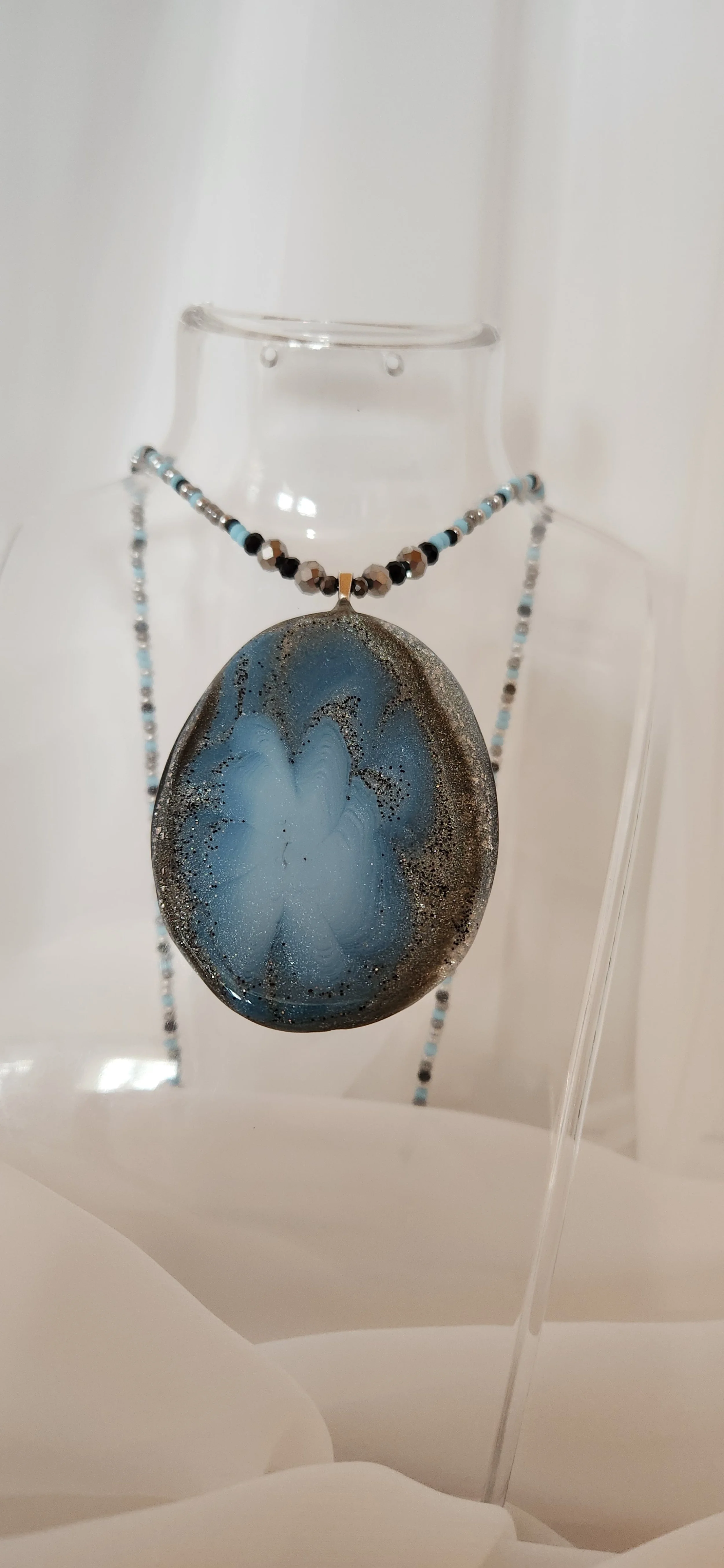 Blue and Silver Large Stone Shaped Pendant Beaded